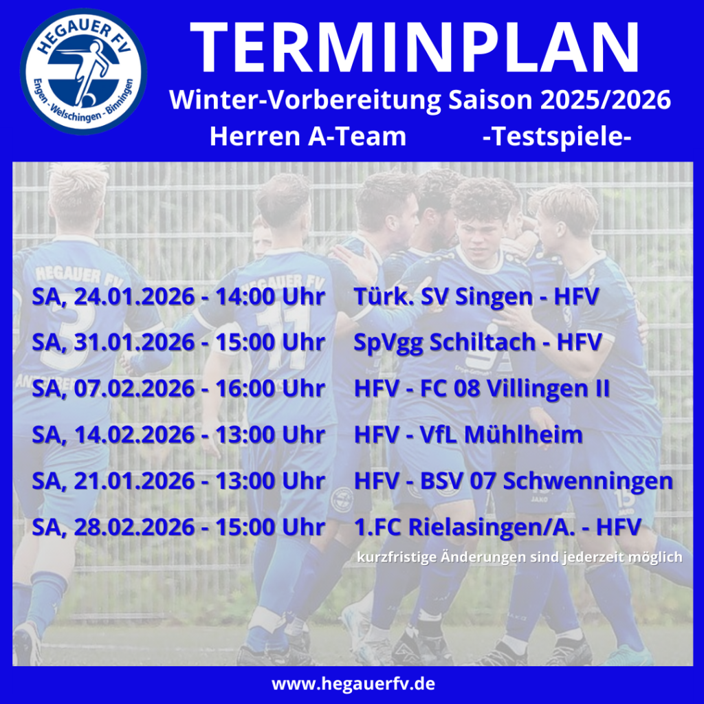 Samstag, 24.01.2026: Türk. SV Singen – HFV 3:1 (3:0) Im ersten Testspiel hinterließ unser A-Team einen sehr guten Eindruck. Unsere Mannschaft konnte teilweise, aber vor allem in der 2. Halbzeit, dem Oberligisten aus Singen ein guter Testspielgegner sein. Die nächsten Spiele: Samstag, 31.01.2026: SpVgg Schiltach – HFV Samstag, 07.02.2026: HFV