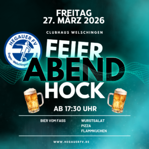 Endlich Wochenende – und das feiern wir gemeinsam!Der Hegauer FV lädt herzlich zum gemütlichen Feierabendhock ein. 📅 Freitag, 27. März 2026🕠 ab 17:30 Uhr📍 Clubhaus des Hegauer FV in Welschingen Freut euch auf einen entspannten Abend in geselliger Runde mit kühlen Getränken, leckerem Essen und bester Stimmung. Ob nach der