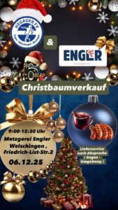 Hallo zusammen,wir möchten Euch über den Christbaumverkauf des Hegauer FV informieren:🌲Samstag, 06.12.2025🌲9.00 Uhr bis 12.30 Uhr🌲vor der Metzgerei Engler in Welschingen🌲Lieferservice nach Absprache🌲Grillwurst, Getränke, Glühwein